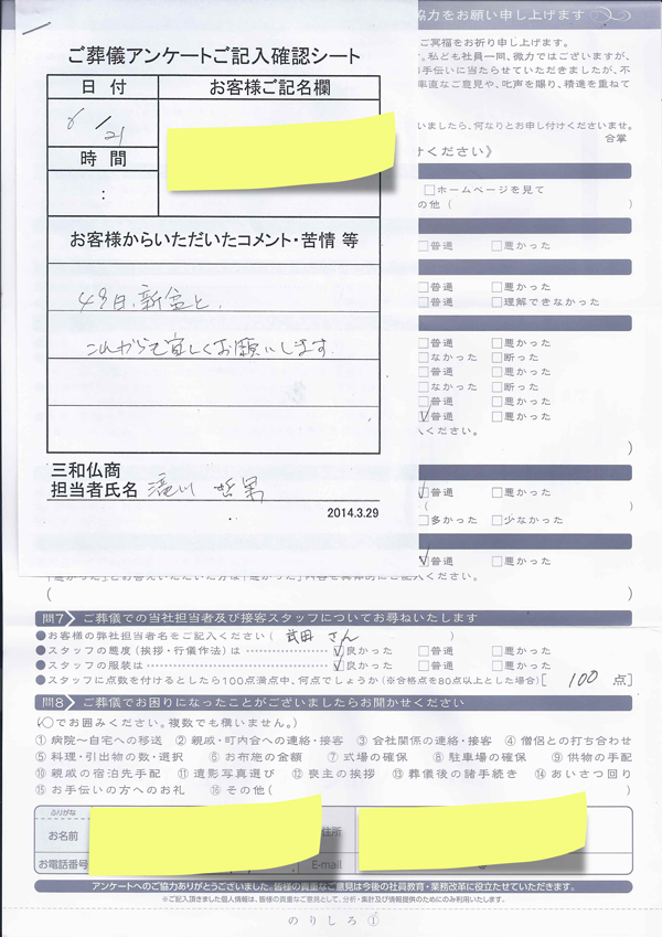【お客様の声】49日、新盆と、これからも宜しくお願いします。